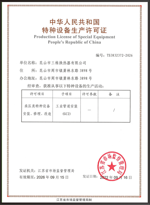 昆山市三維換熱器有限公司注冊資本5000萬元,資產2.1億元,公司地址位于江蘇省昆山市周市鎮蕭林東路3898號,法人代表為顧安生,公司設有技術部、生產部、檢驗部。